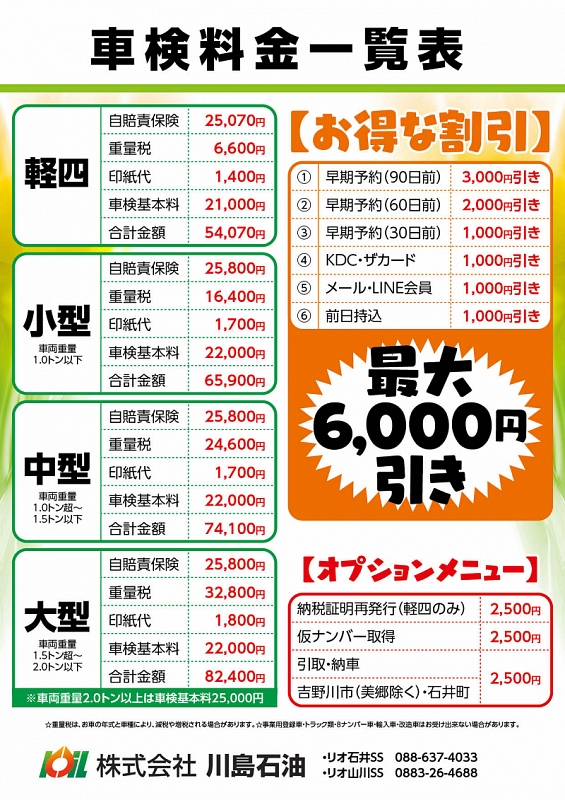 当社の「リオ・イシイSS」「リオ・ヤマカワSS」で、、車検キャンペーンをおこなっております。スタッフは、国家資格整備士により「きめ細かいサービス」と、「料金は出来る限りお安く」という、車検を実施しております。