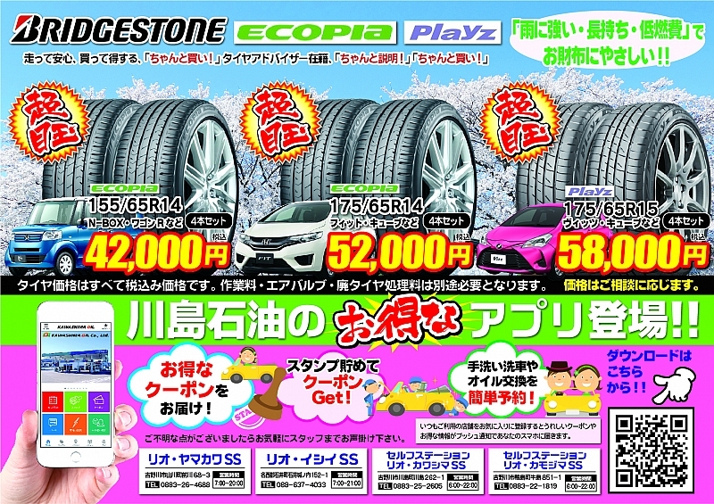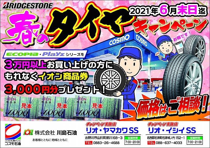 当社、リオ・山川、リオ・石井SSにて3/16~6月末までの間に当店指定のタイヤ購入及び条件達成で「イオングループ」の¥3,000分の商品券を進呈しております。