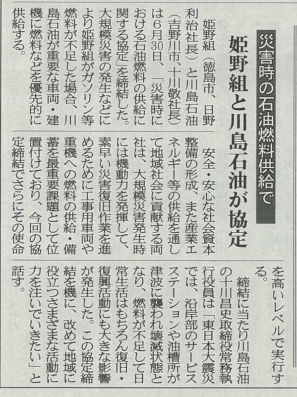 社会的責任を果たすエネルギー供給会社として、BCP対策の一環で姫野組様と「災害時における石油燃料の供給に関する協定書」を締結。