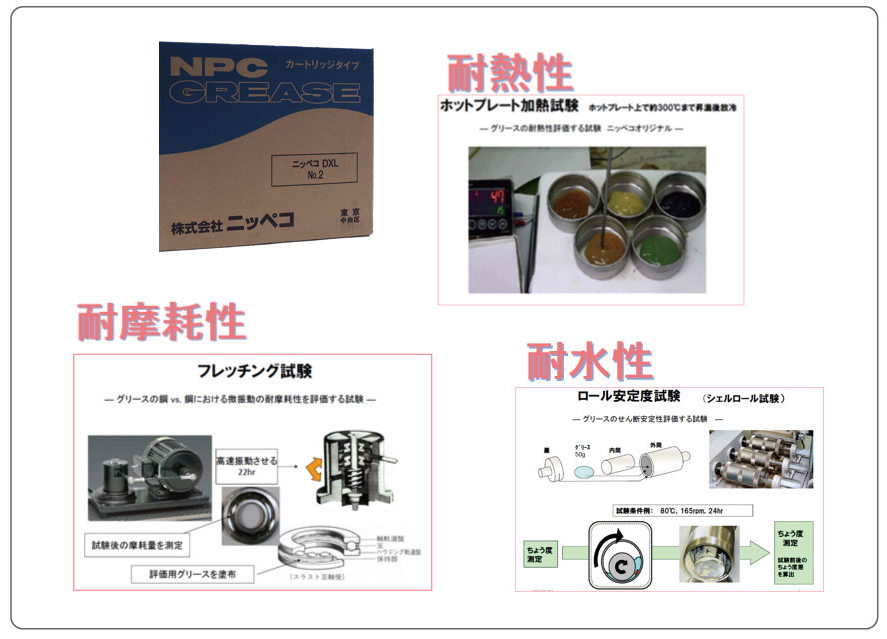 耐水性・耐薬品性・耐熱性・耐圧性に優れた増ちょう剤(カルシウムスルフォーネトを使用したグリースでパート毎に分けていたグリースを油種統一する事が可能などの提案も行っております。 |